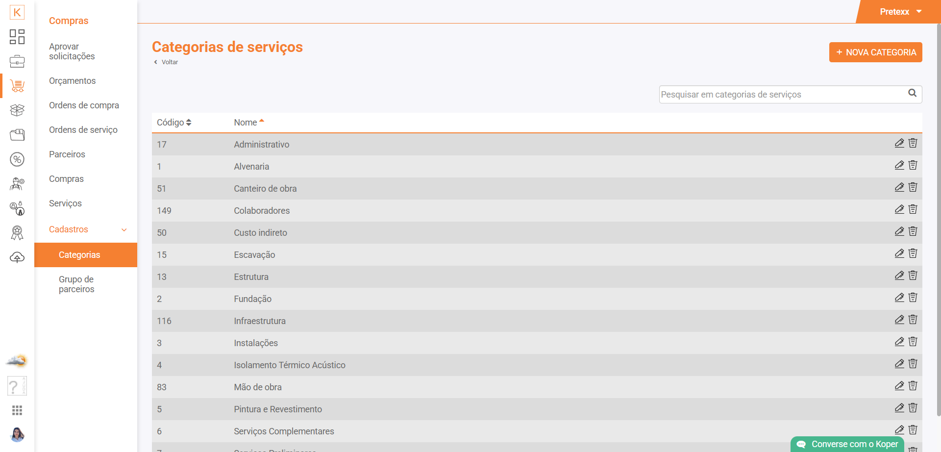 É feito aqui o cadastro de novas categorias de serviços. Também pode ser feito na página Compras > Serviços ou direto no cadastro de nova ordem de serviço.