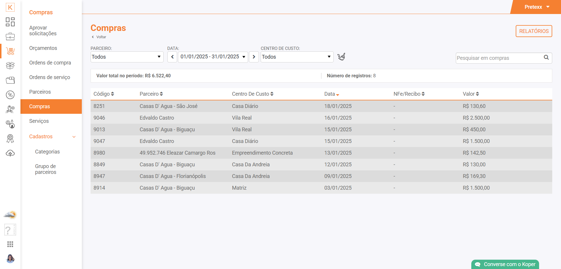 Espaço para verificar as compras já realizadas anteriormente, podendo filtrar por parceiros, data e centro de custo.