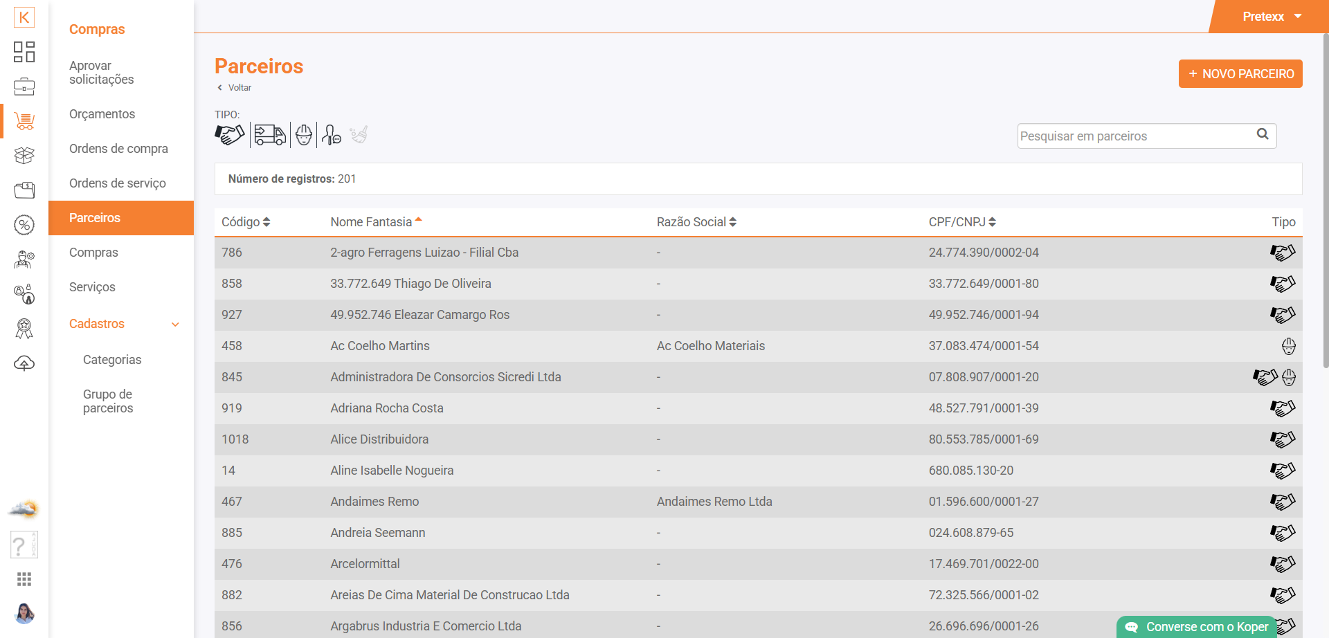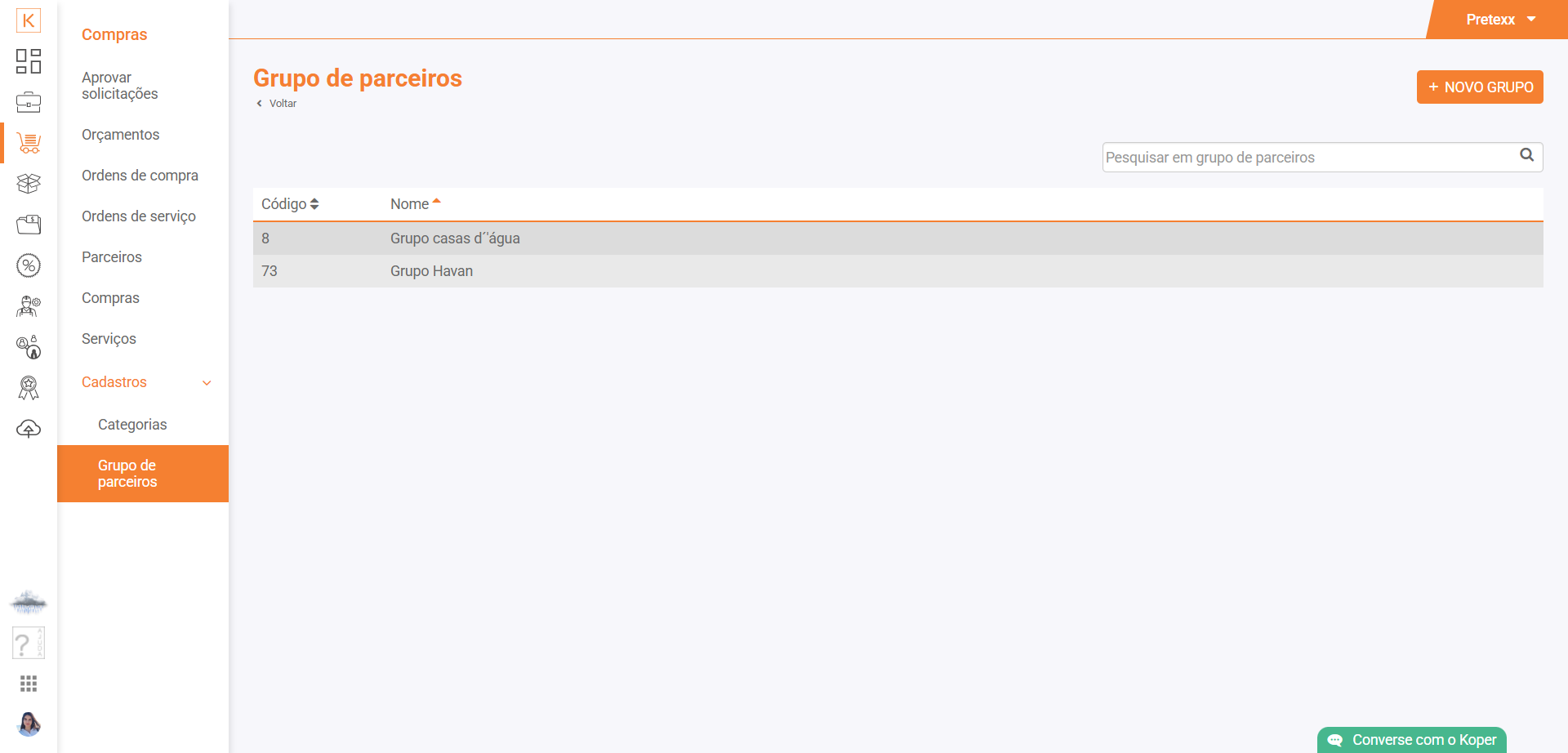 Para que tenha uma melhor organização dos teus parceiros, o Koper possui uma área para que consiga agrupar empresas e filiais.