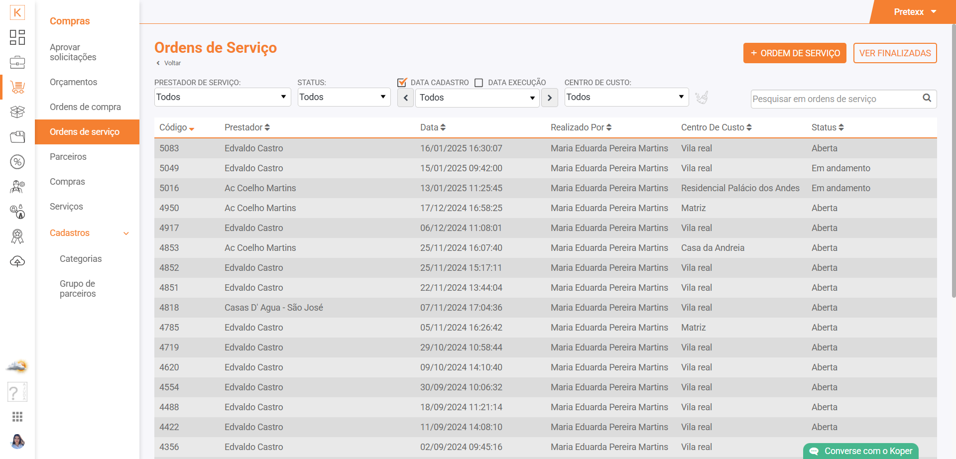 São exibidas as ordens de compra emitidas, de maneira ordenada e passívas de filtragem por fornecedor, local de entrega, status e/ou data e pesquisa direta. Ainda é possível criar a qualquer momento, sem necessidade de um orçamento prévio.