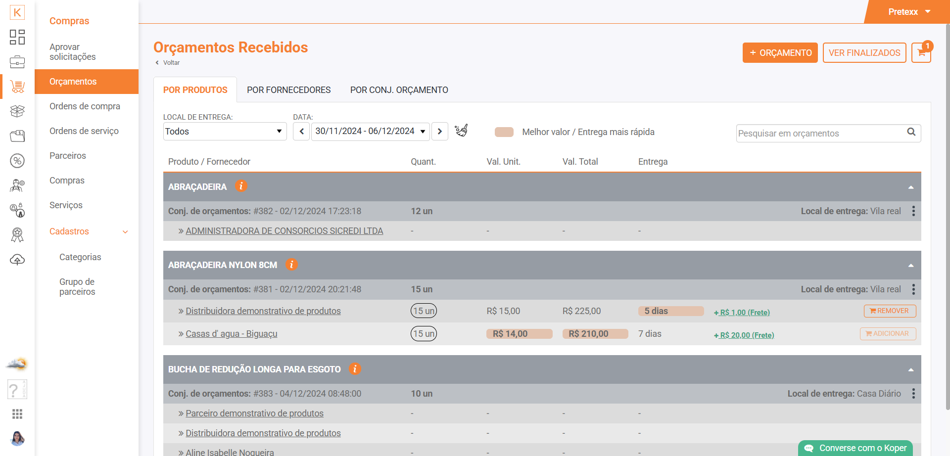 Assim que um orçamento é gerado, o Koper disponibiliza a opção de enviar um pedido de orçamento por e-mail para seus fornecedores cadastrados no sistema, e assim que eles respondem os valores são registrados automaticamente, para que possa escolher o melhor, considerando valor, prazo de entrega e frete. A interface automaticamente destaca quais possuem melhor valor ou entrega mais rápida comparado aos demais. Pode-se, visualizar os orçamentos por produtos ou por fornecedores. Com poucos cliques, faz-se um novo orçamento a qualquer momento.