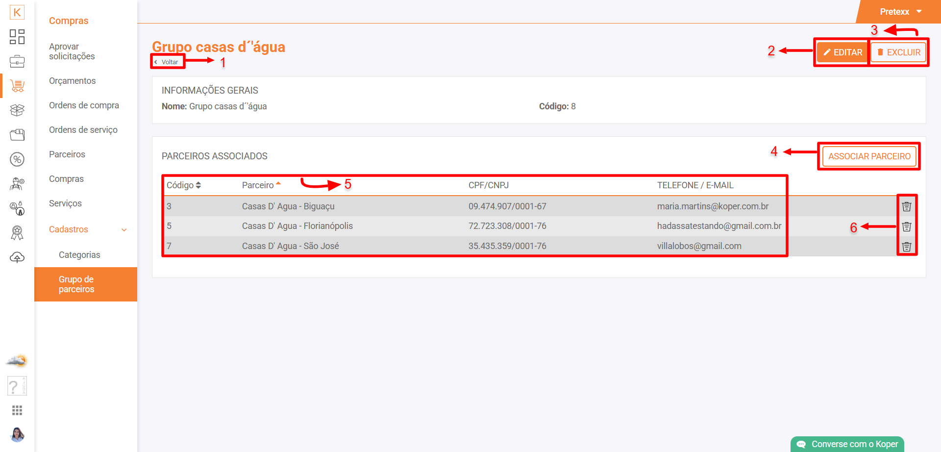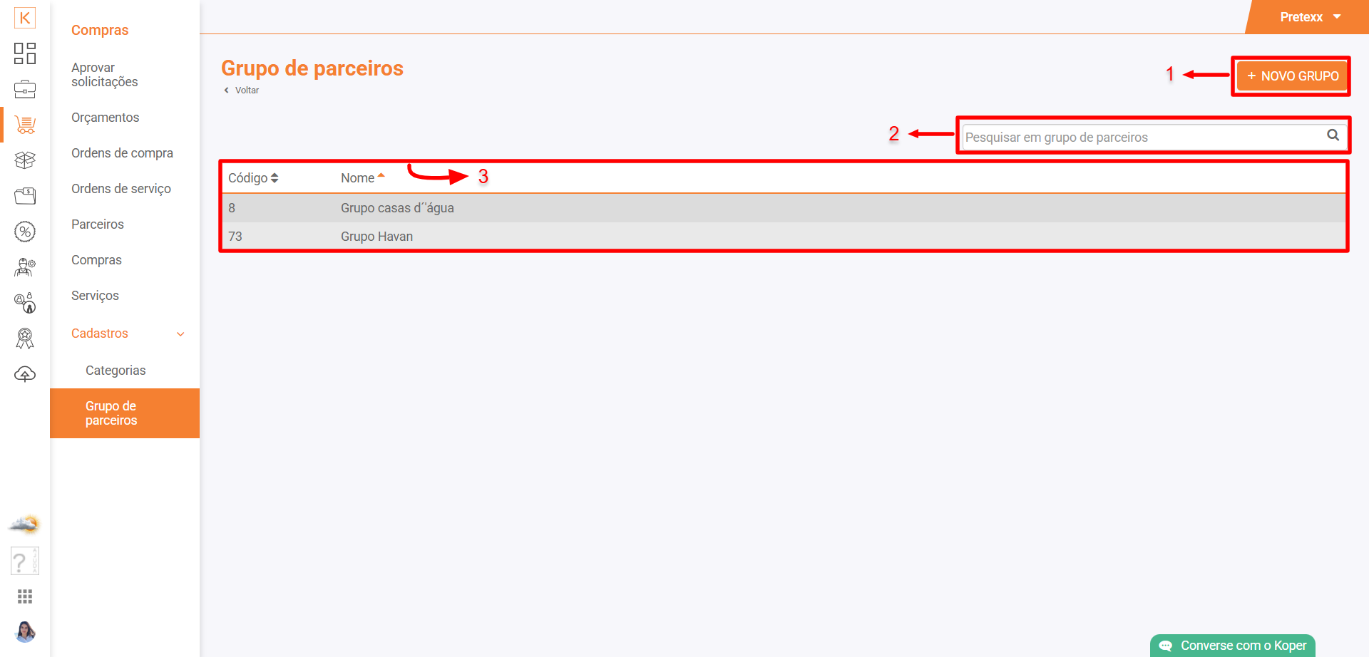 Acesse Koper > Compras > Cadastro - Grupo de parceiros