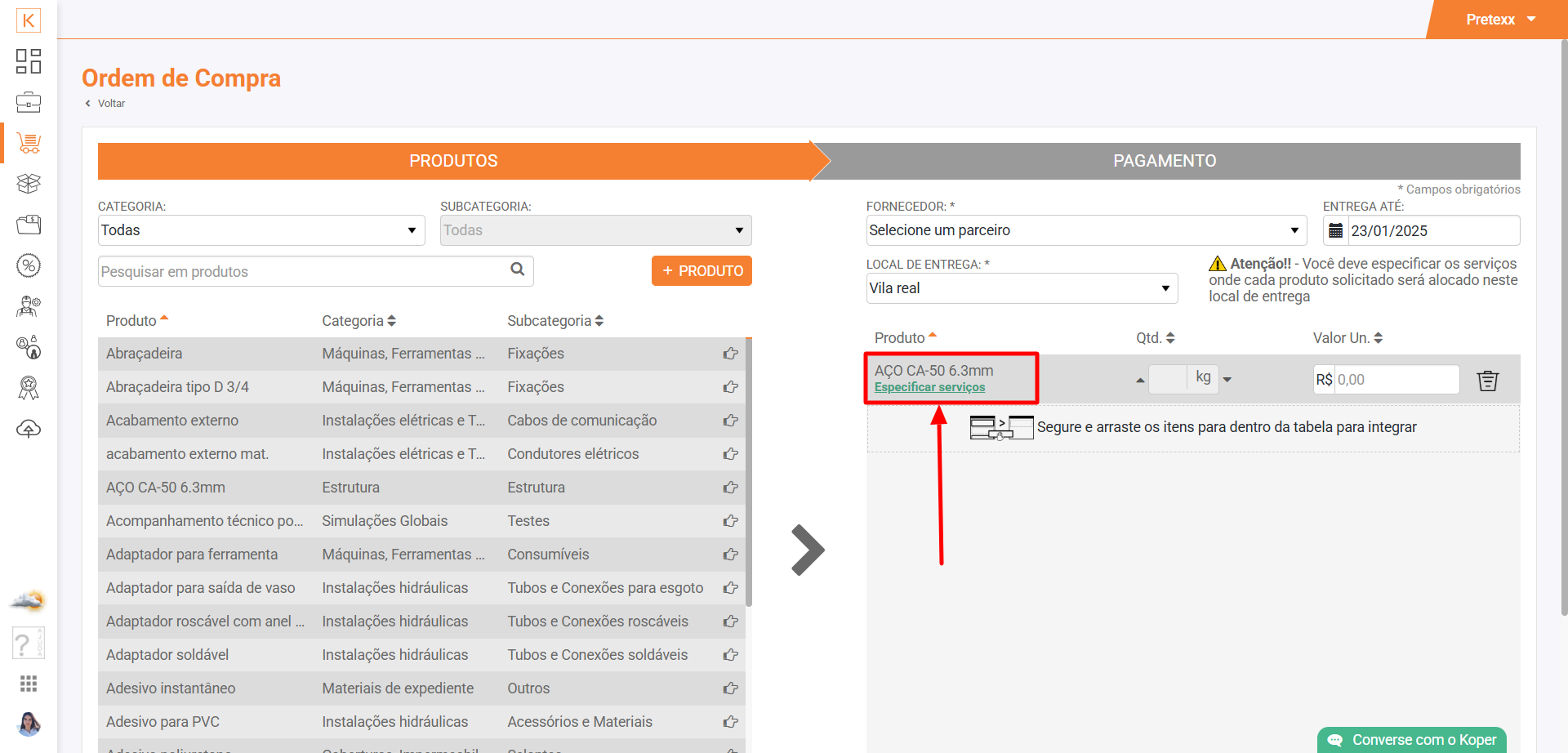- Clique e arraste o produto que deseja adicinar em sua ordem de compra, da lista da direita para a lista da esquerda (ou clique no ícone