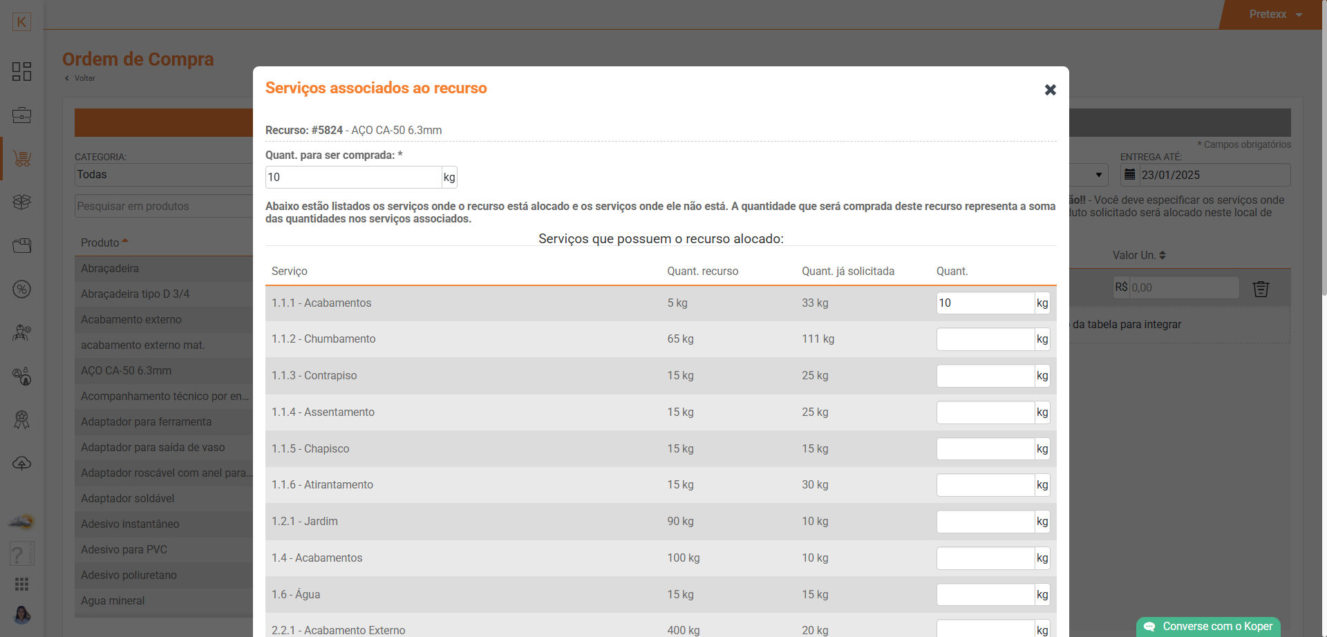 Quando for gerar uma Ordem de compra, e o local de entrega possuir Acompanhamento de obra, será necessário definir para qual serviço este insumo será utilizado.