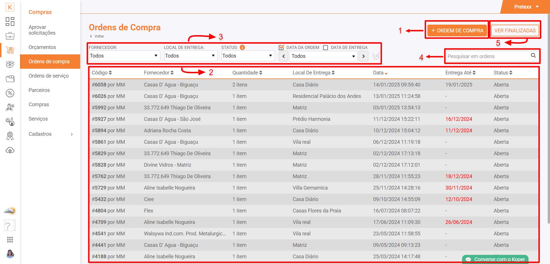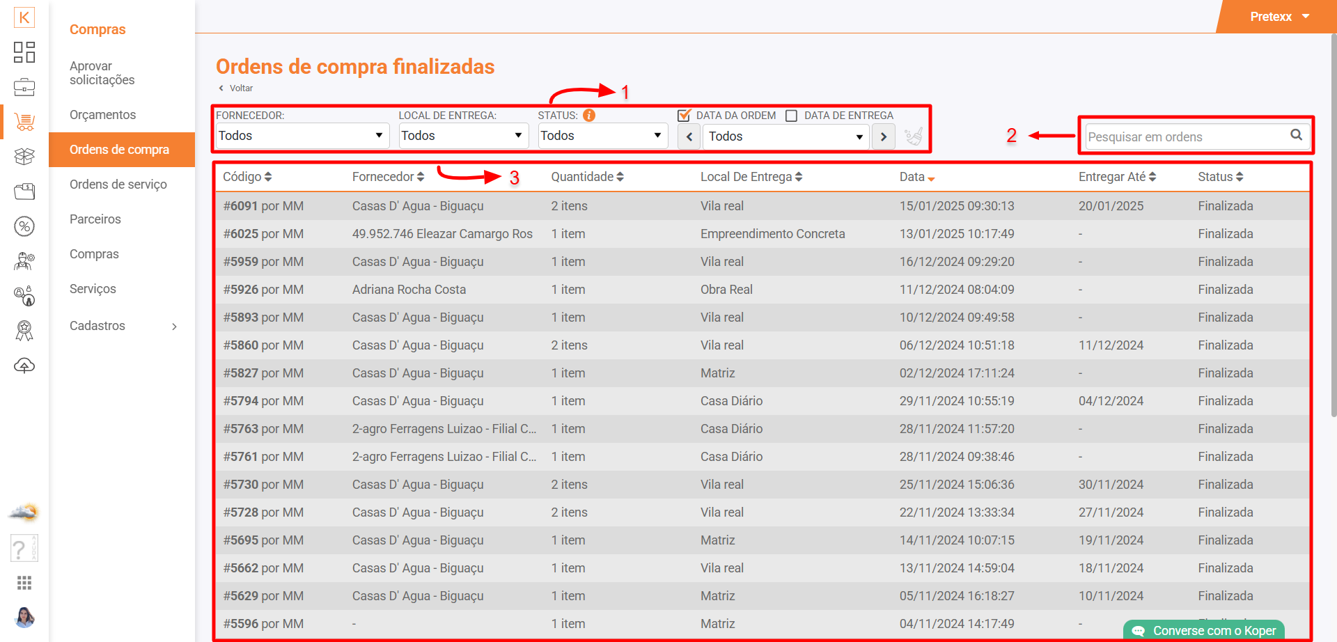 Acesse Koper > Compras > Ordens de compra