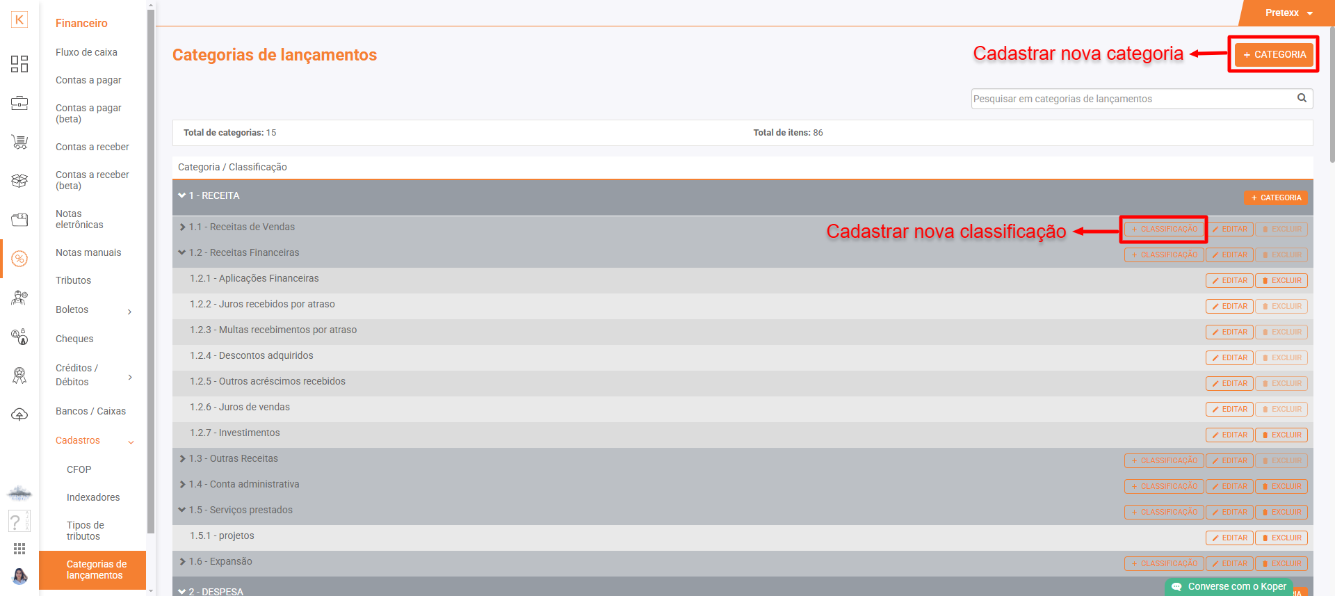 Aqui você tem a sua disposição um verdadeiro Plano de Contas, o qual poderá ser utilizado para Classificar lançamentos de Entrada e Saída. Estas Categorias de Lançamentos (plano de contas) já vem prontas quando você faz seu cadasto no Koper. Porém, é possível editar este plano completamente.