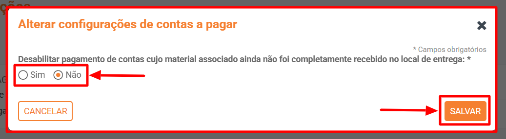 - Ao habilitar esta configuração, como mencionado, o pagamento da conta associada só poderá ser realizado após a confirmação de que o material foi completamente recebido no local de entrega.