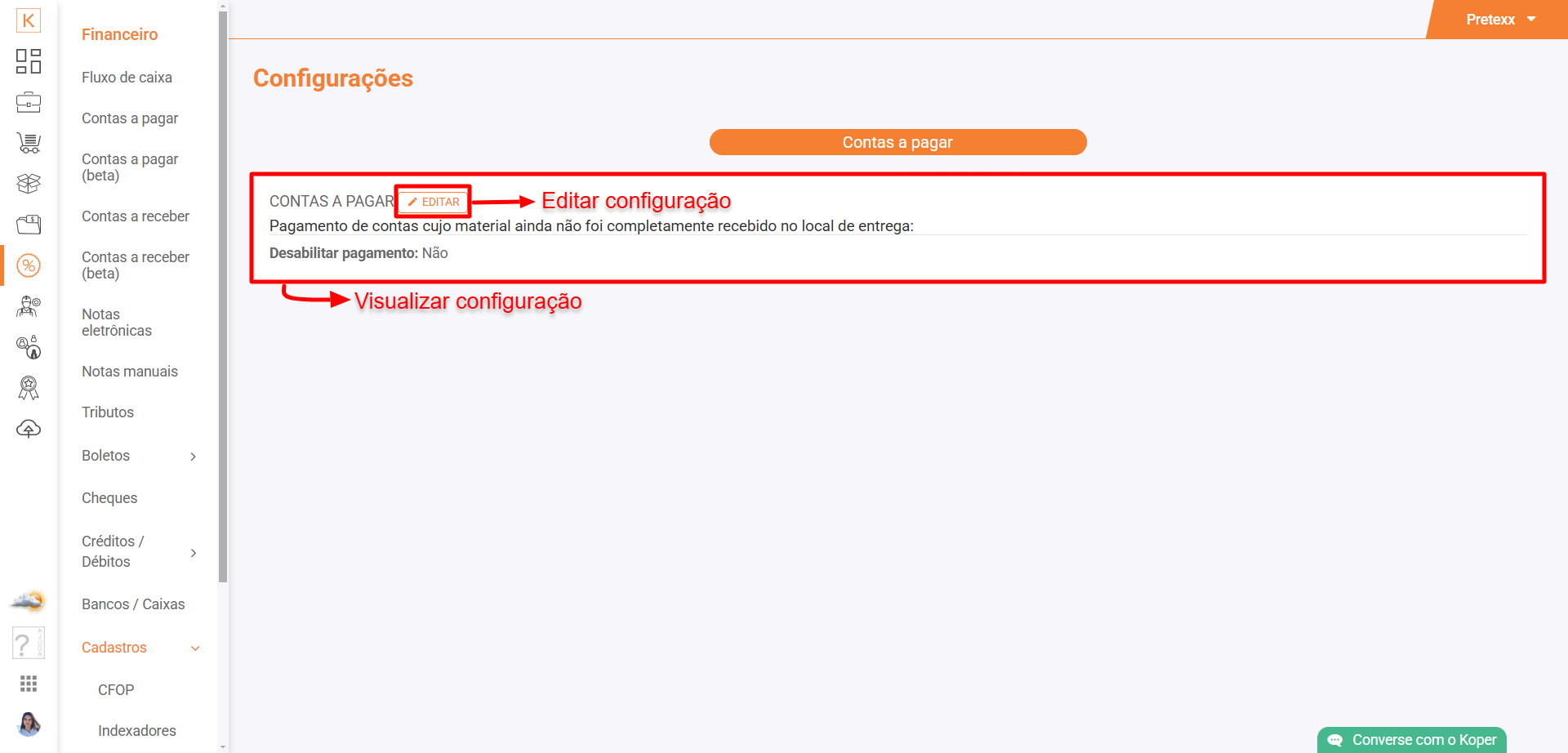 Para fazer essa configuração, entre no módulo Financeiro > Cadastros > Configurações: