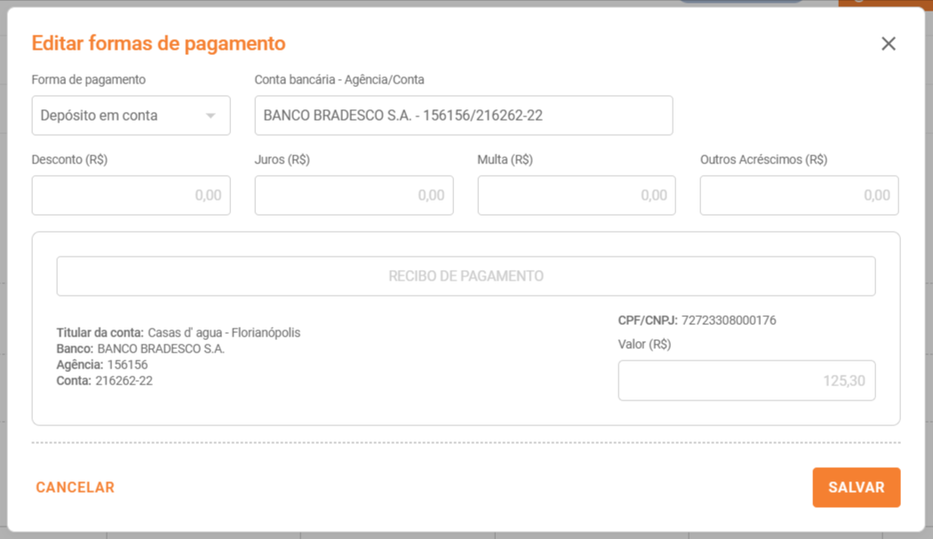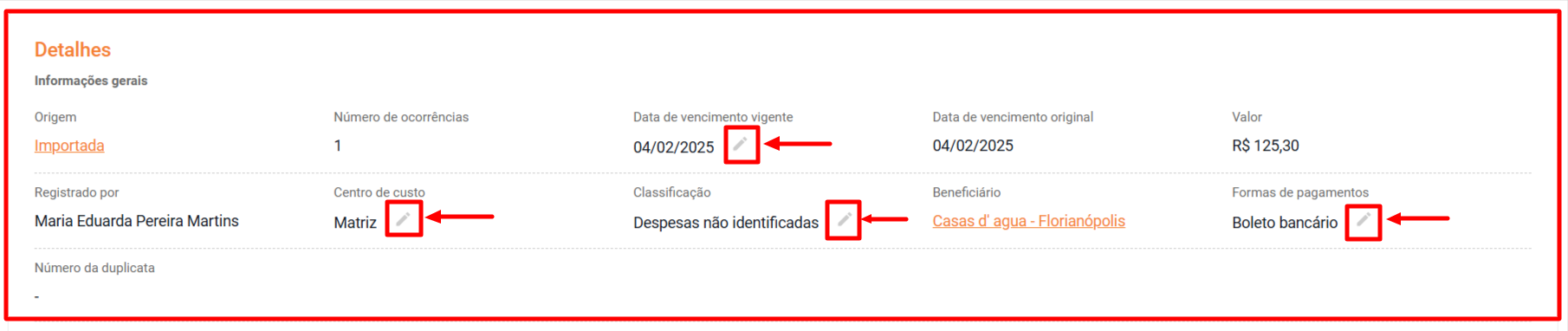 - - Alterar data de vencimento, Forma de pagamento, Centro de custo, Classificação, Recibo de pagamento e Guia para depósito