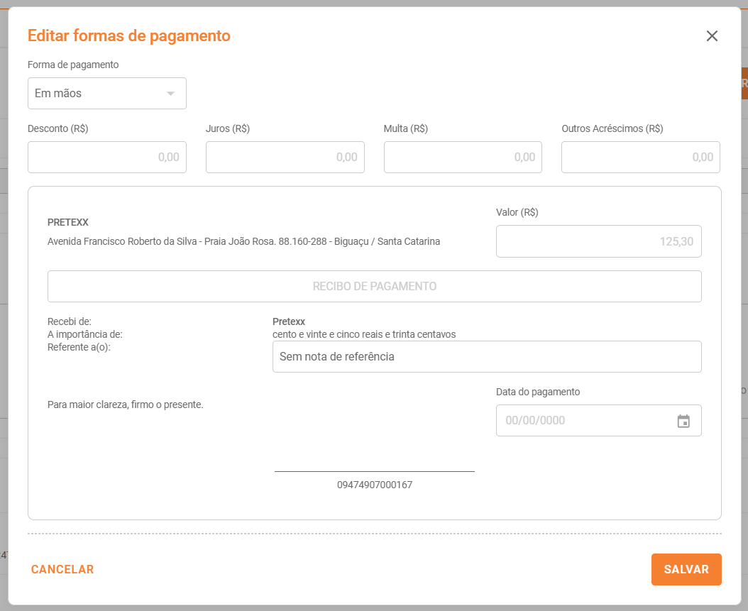 - - E caso seja em mãos, poderá: Gerar Recibo e adicionar Comprovante de pagamento.