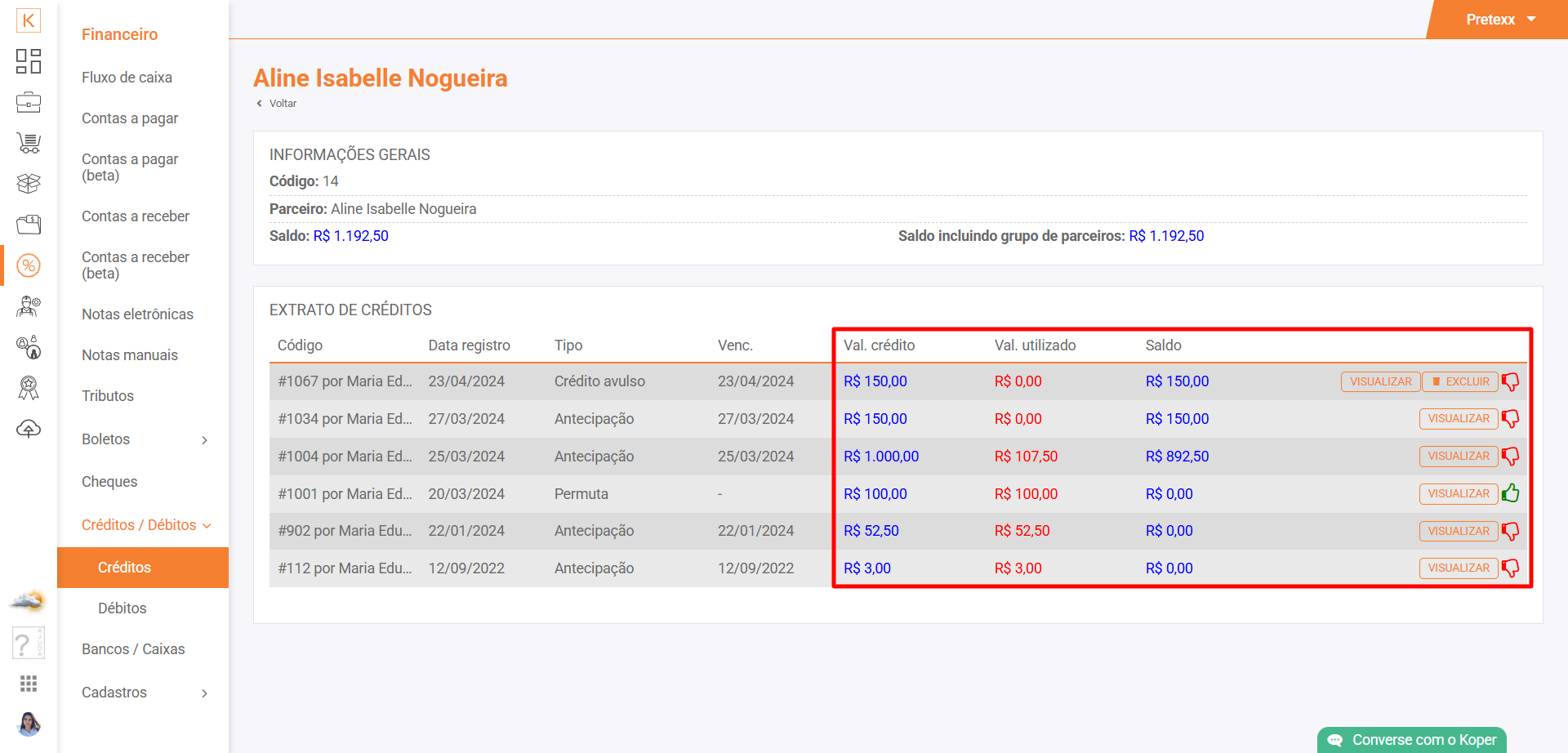 Na página de detalhamento você poderá visualizar o valor individual de cada crédito, o quanto já foi utilizado e seu saldo. Se for um crédito a vulso (que gera um Contas a Pagar) você poderá ver se já está pago ou não através dos ícones