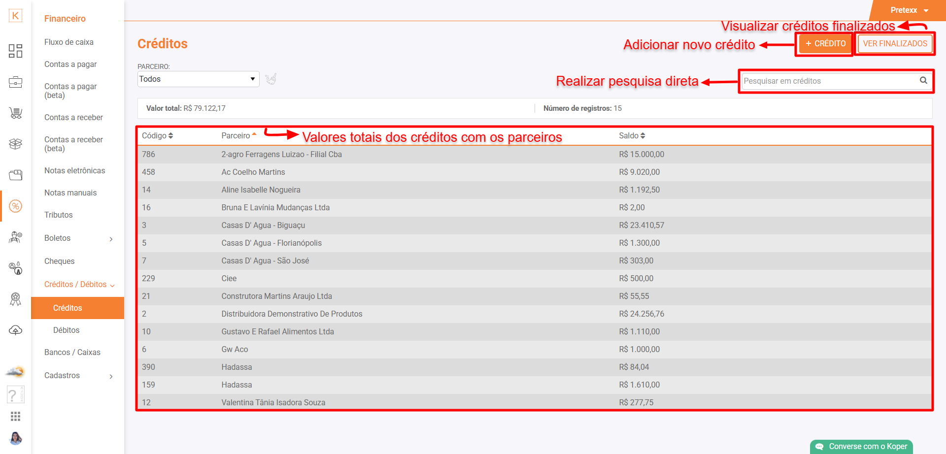 Nesta parte do sistema você poderá ver todos os créditos que possui junto aos seus Parceiros (fornecedores) e também poderá lançar novos créditos. Os créditos podem ser utilizados para fazer abatimentos (parciais ou totais) no Contas a Pagar ou também fazer abatimentos diretamente no lançamento de uma Nota Eletrônica ou Nota Manual.