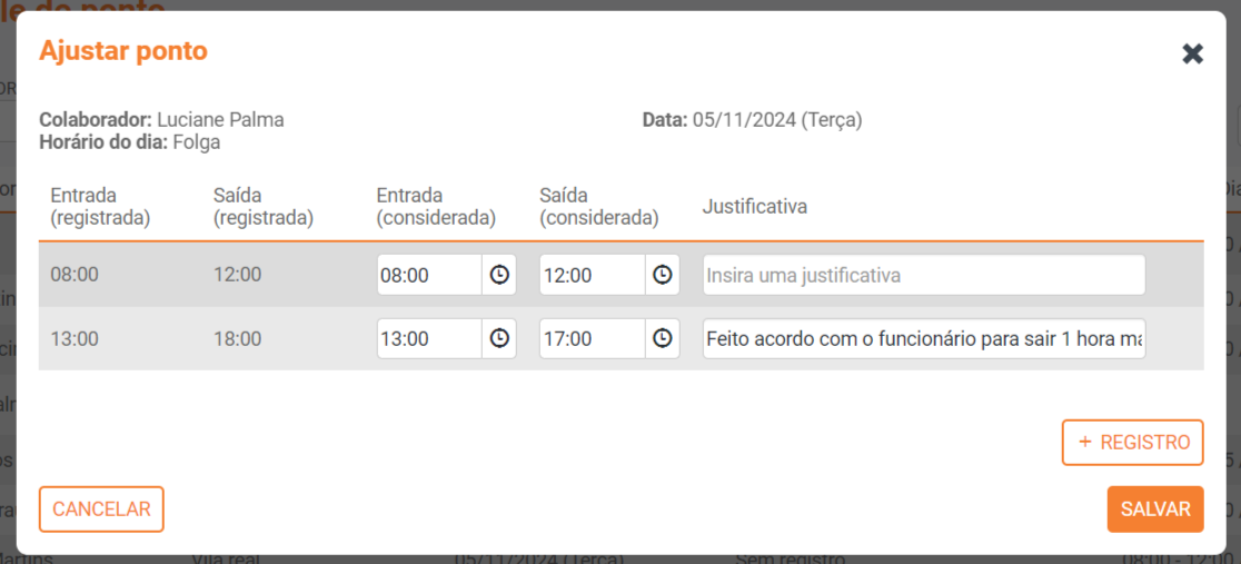 - No painel REGISTROS DE PONTO identifique o registro que deseja ajustar e clique em
