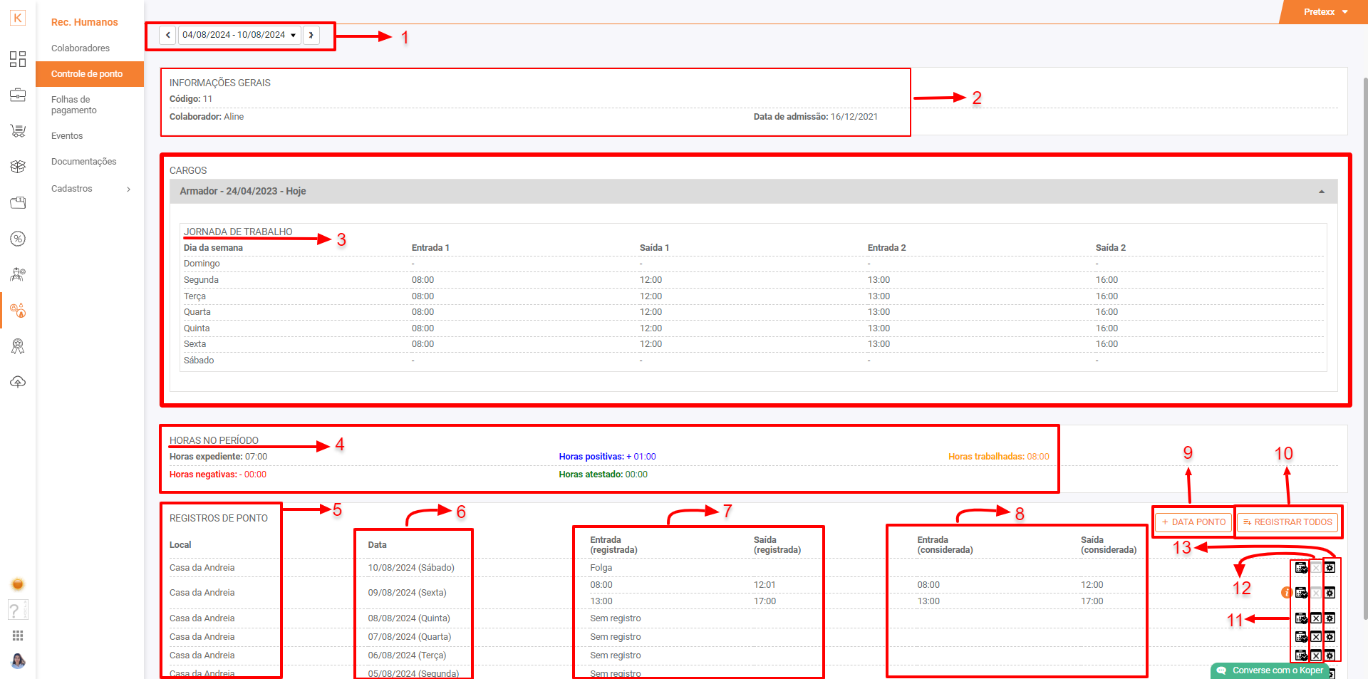 - 9: Abrir detalhes do controle de ponto de cada colaborador.