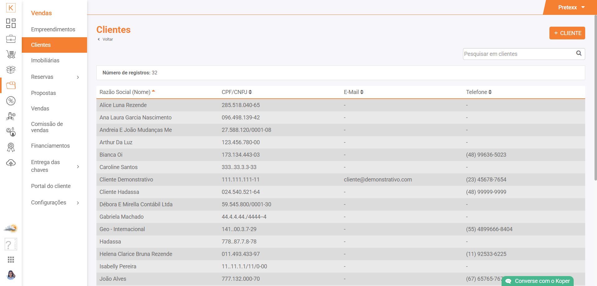 Nessa aba, ficam registrados os clientes com quem a construtora/incorporadora negocia. É possível visualizar seu cadastro e histórico de negociações.