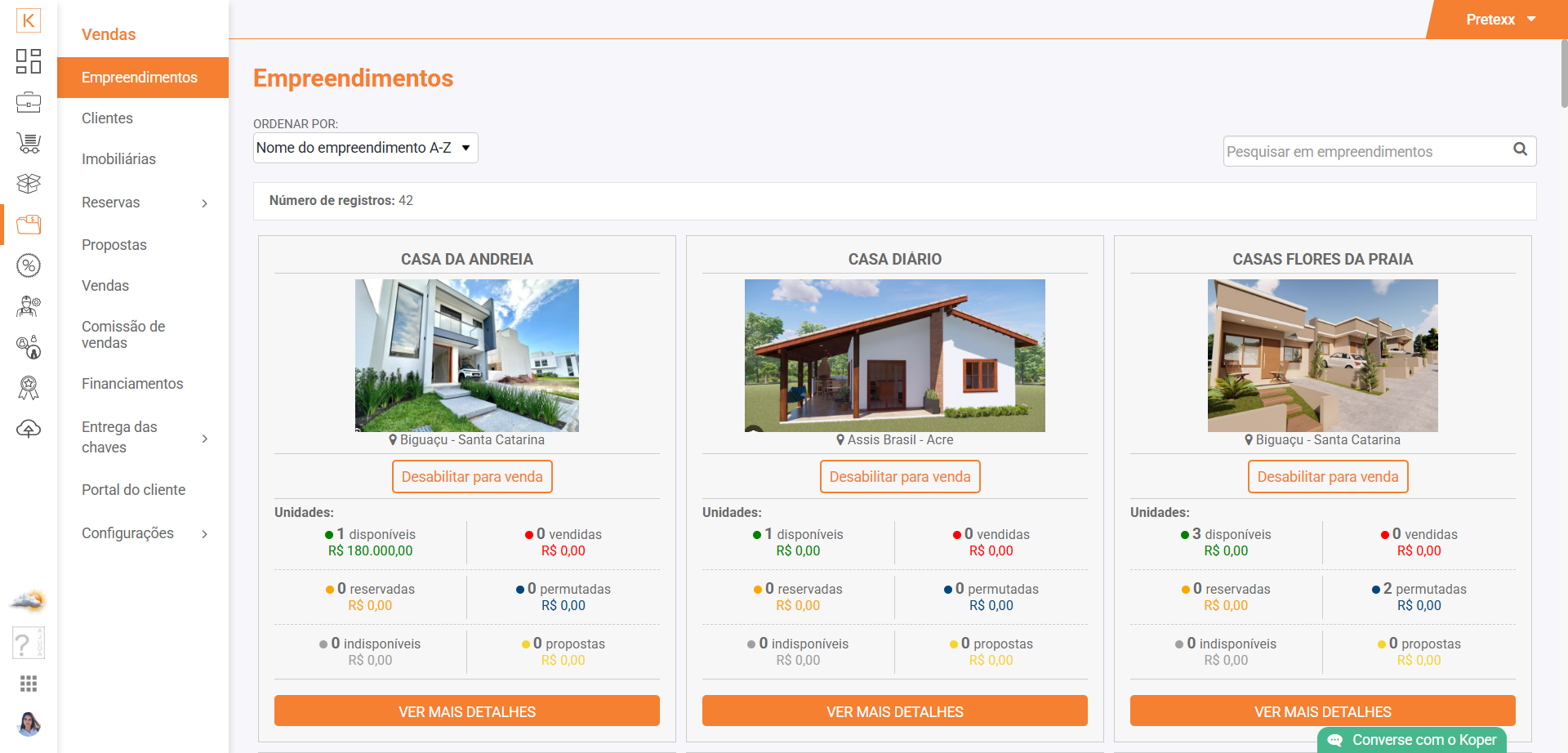 Esta aba fornece uma vista geral de todos os empreendimentos da construtora, prontos ou em andamento. Com um clique, pode-se habilitar ou desabilitar determinado empreendimento para negociação.