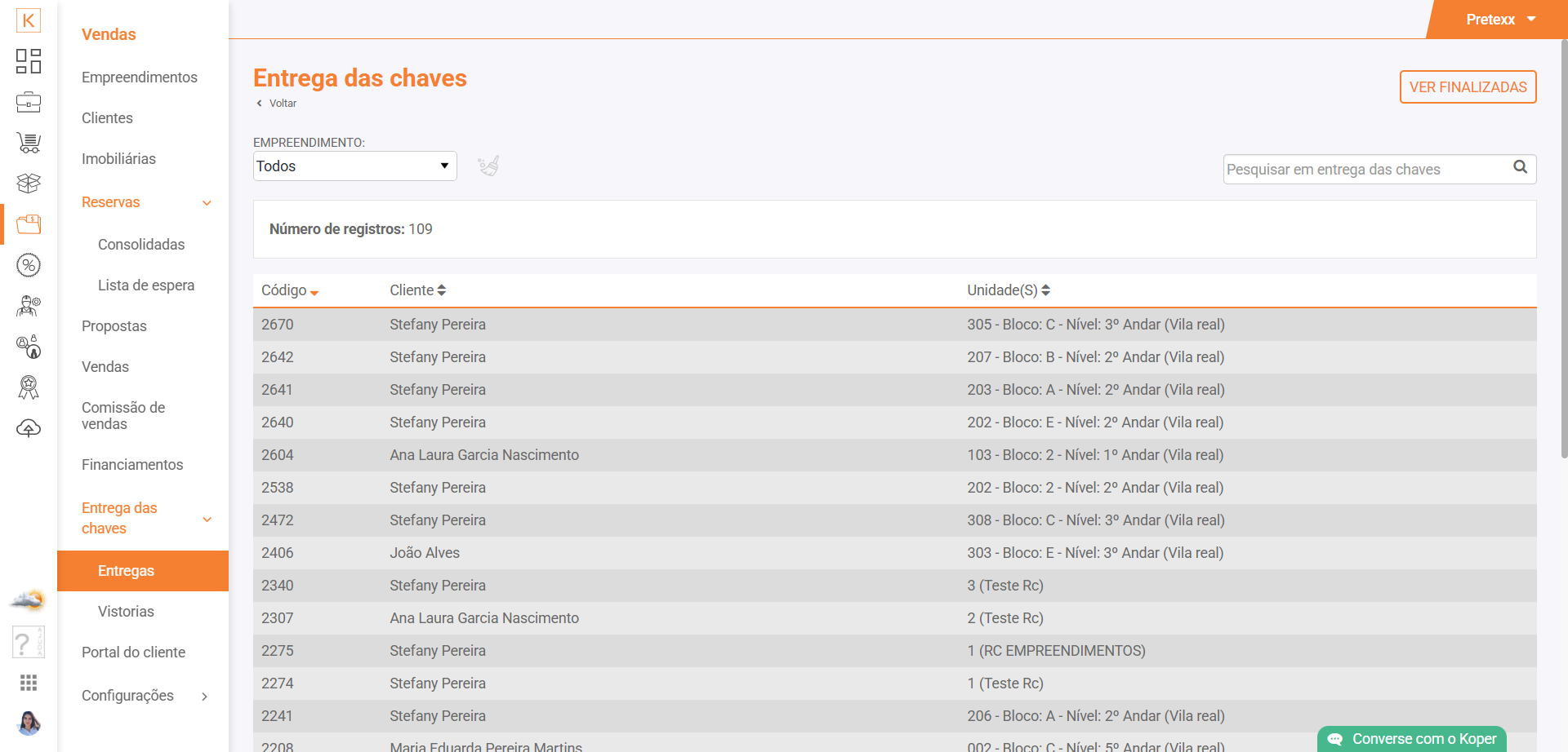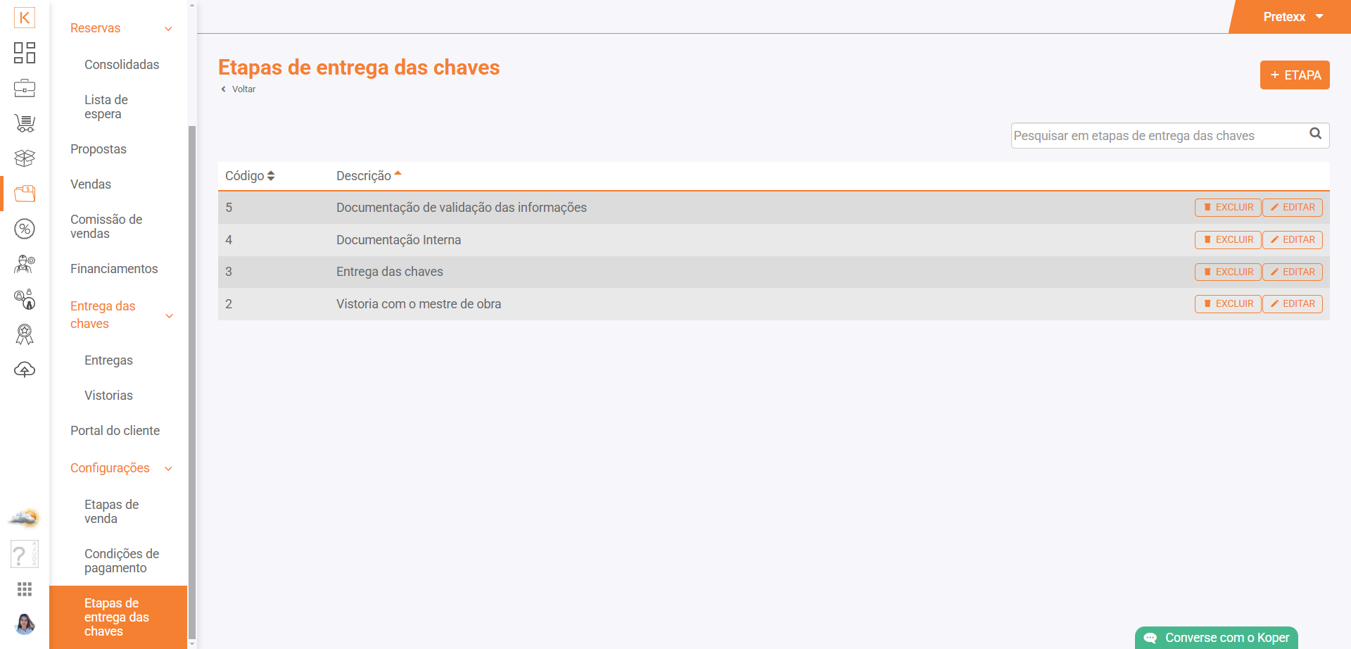 Esta aba é reservada à vinculação de uma nova etapa de entrega das chaves em empreendimentos específicos, como visto na imagem acima.