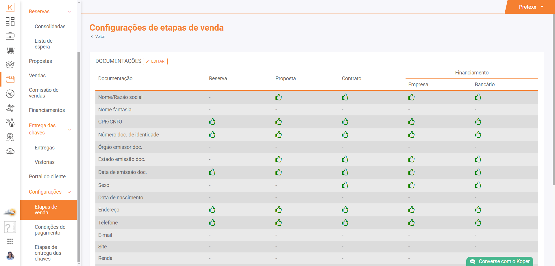 Aqui o usuário editará a documentação a ser solicitada para cada etapa da venda, para financiamentos, etc.