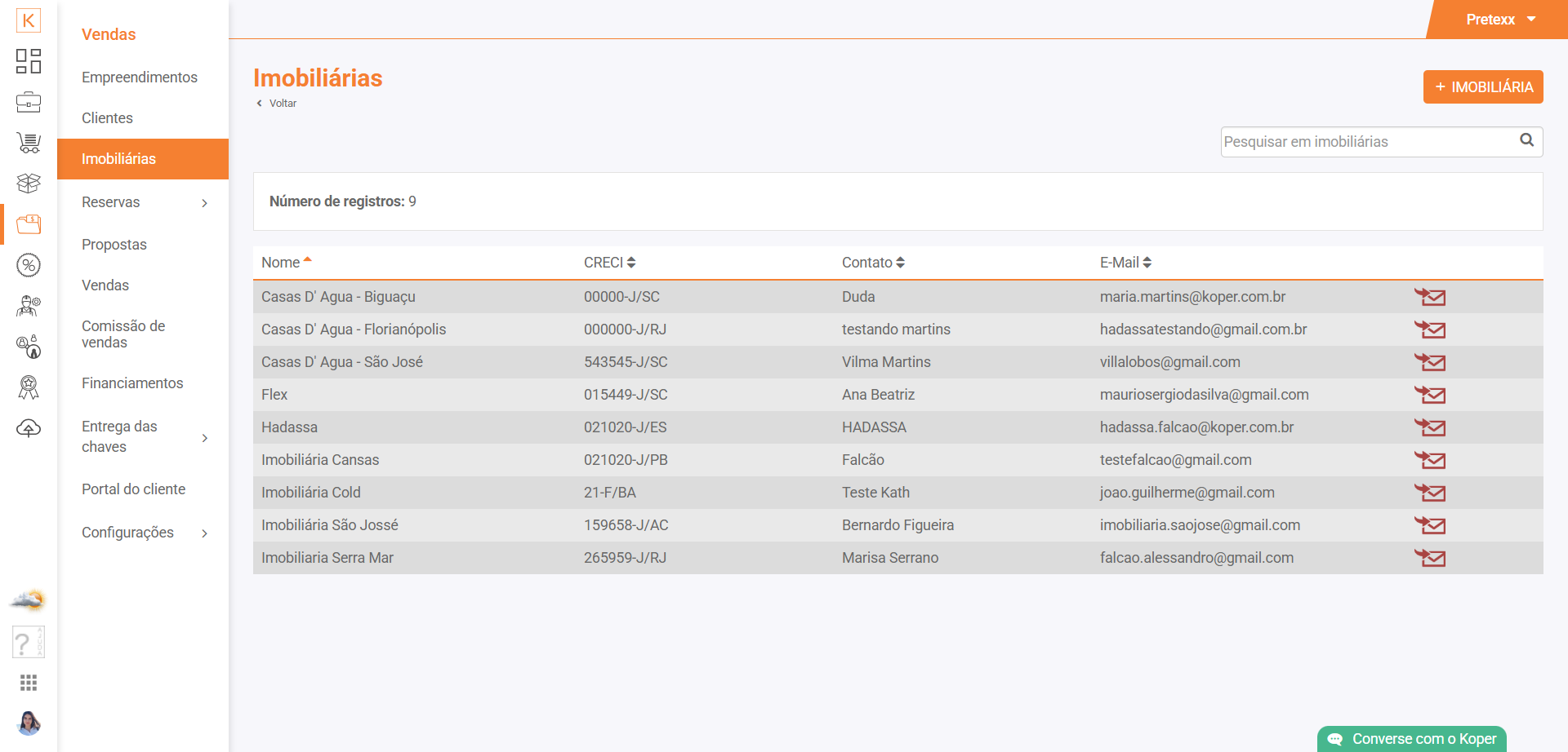 Aqui ficam catalogadas todas as imobiliarias cadastradas e autorizadas a comercializar unidades em nome da incorporadora. Também pode-se cadastrar novas a qualquer momento.
