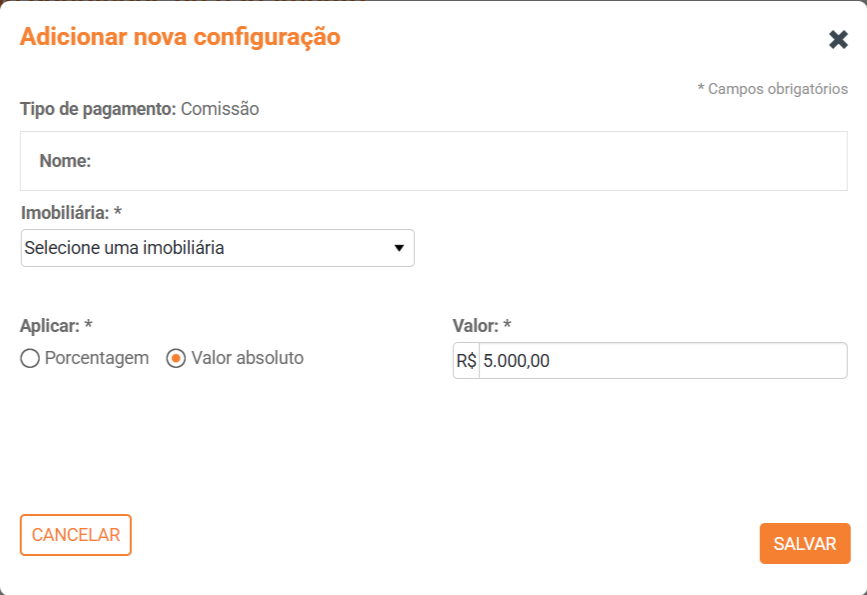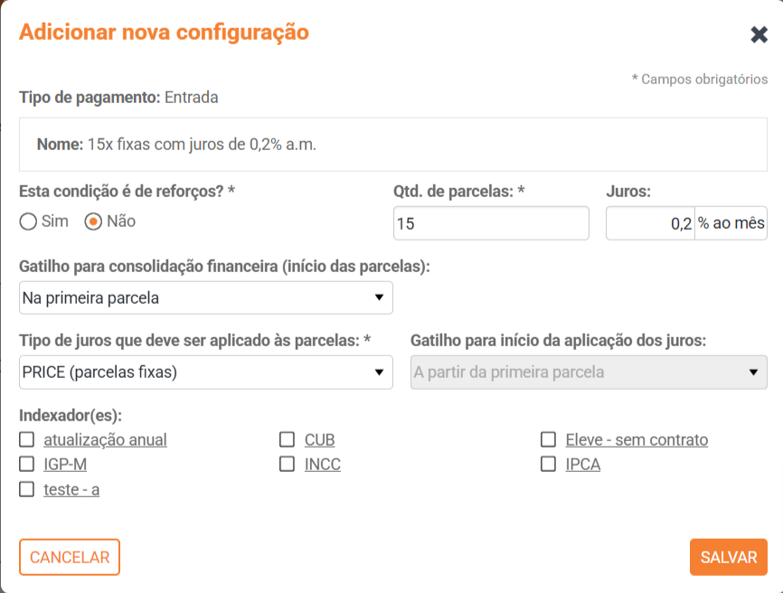 Use essa parte do software para cadastrar novas Condições de Pagamento de comissão , de entradas e de saldos para a construtora.