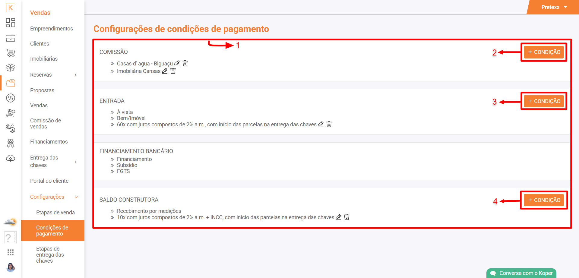Acesse Koper > Vendas > Configurações > Condições de pagamento