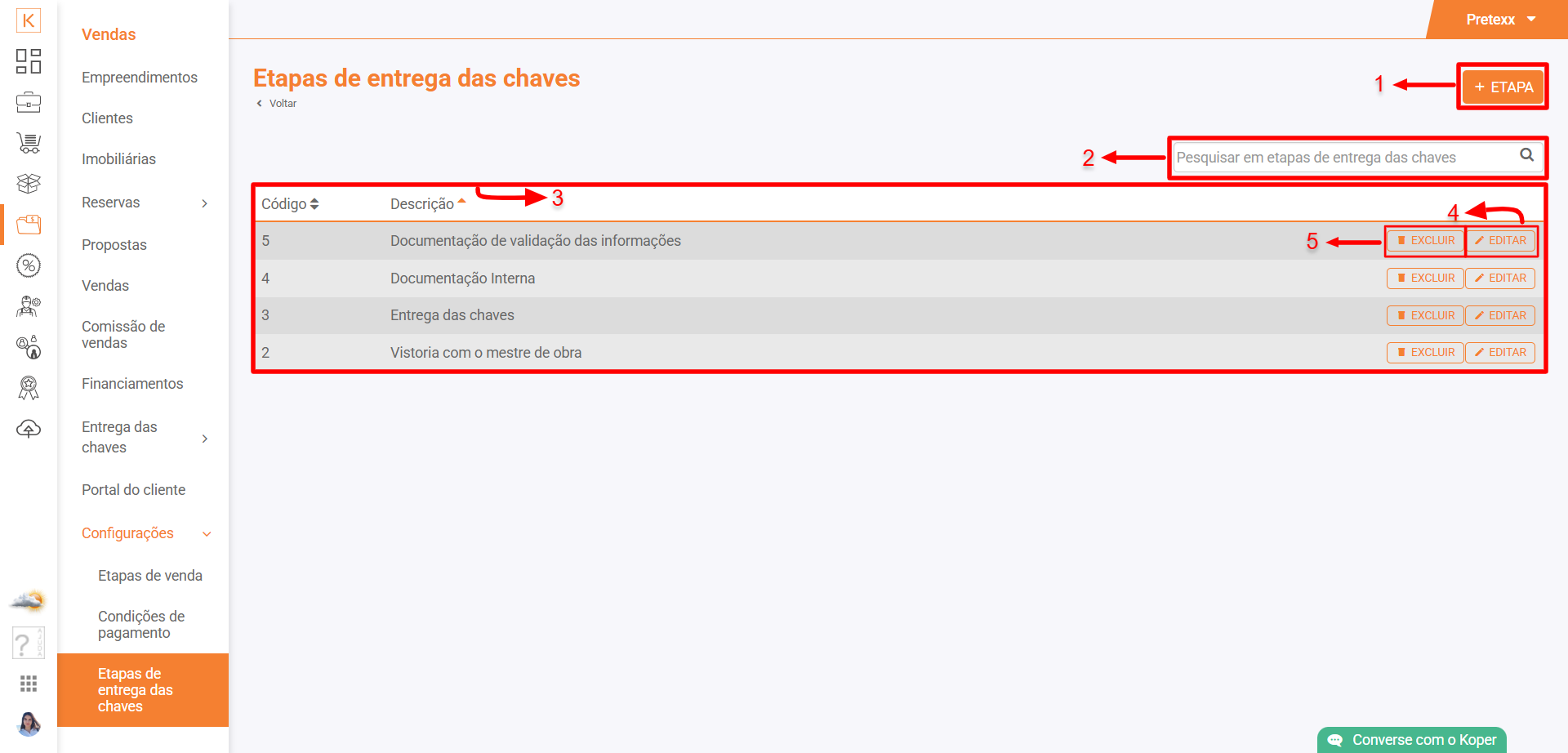 Acesse Koper > Vendas > Configurações > Etapas de entrega das chaves