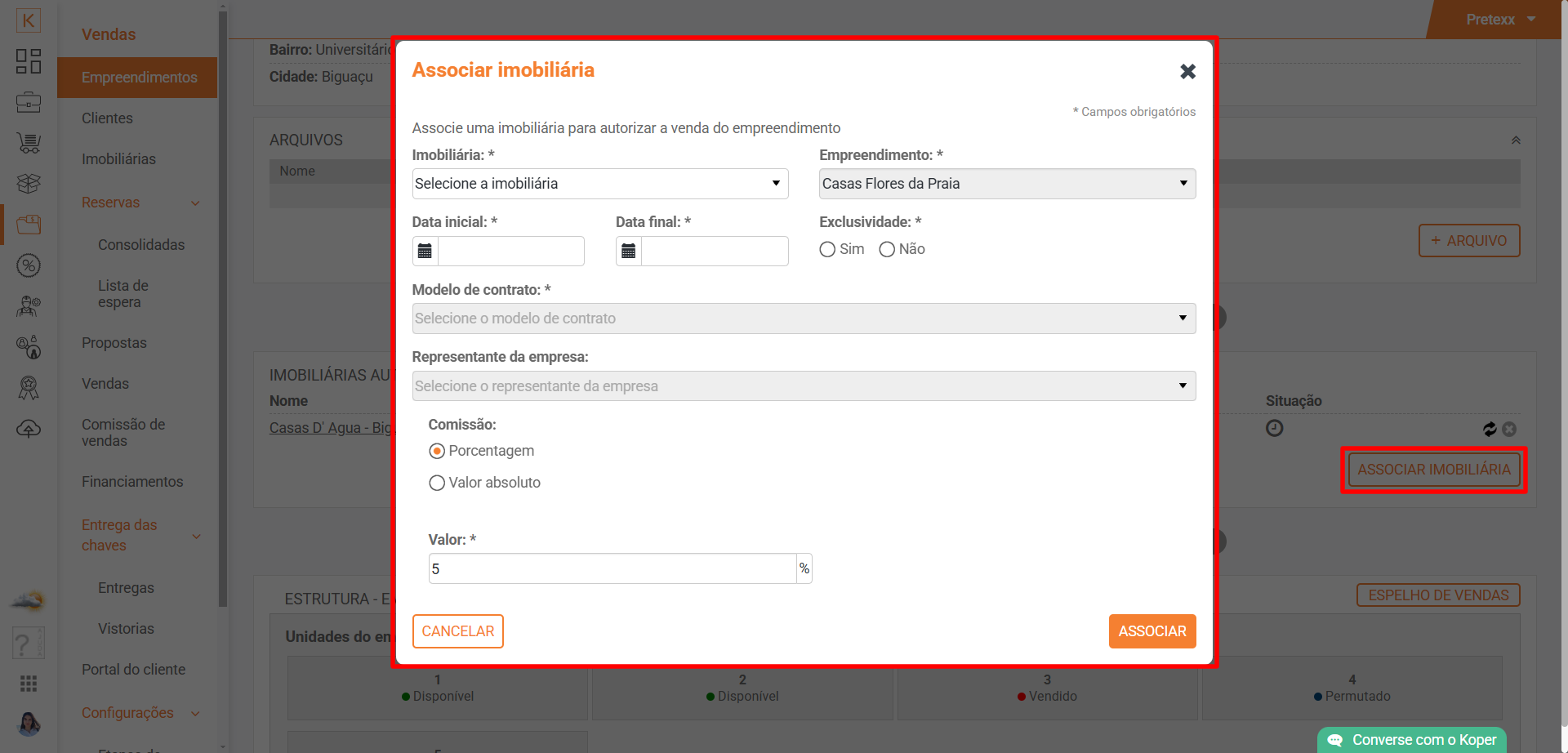 Assim como no cadastro da imobiliária, é possível realizar a associação de uma imobiliária a um empreendimento, direto do cadastro do próprio empreendimento.