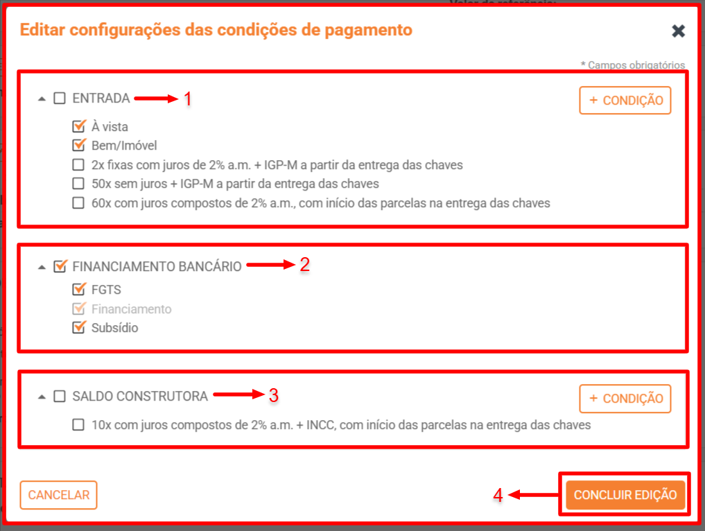 ; - Selecione as condições de pagamento que poderão ser utilizadas nas vendas deste empreendimento ou cadastre uma nova;