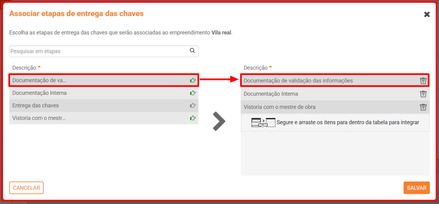 ; - Na janela que abrir adicione na coluna da direita as etapas de entrega das chaves que deseja associar a este empreendimento;