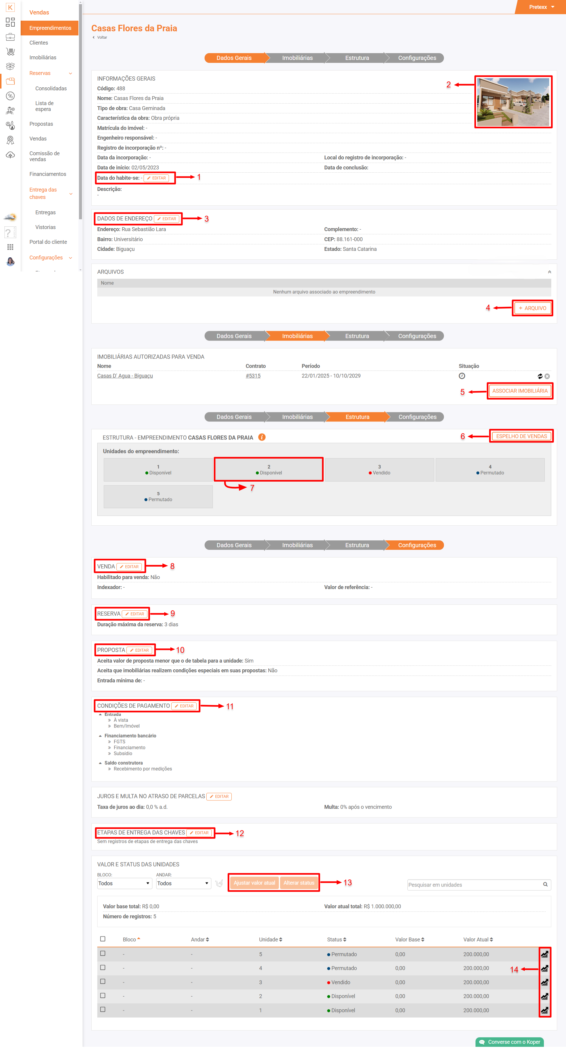 Ao acessar seu empreendimento é possível habilitá-lo para venda, autorizar uma imobiliária para vendê-lo, realizar reservas,propostas e vendas de unidades, associar condições de pagamento e ajustar o valor das unidades.