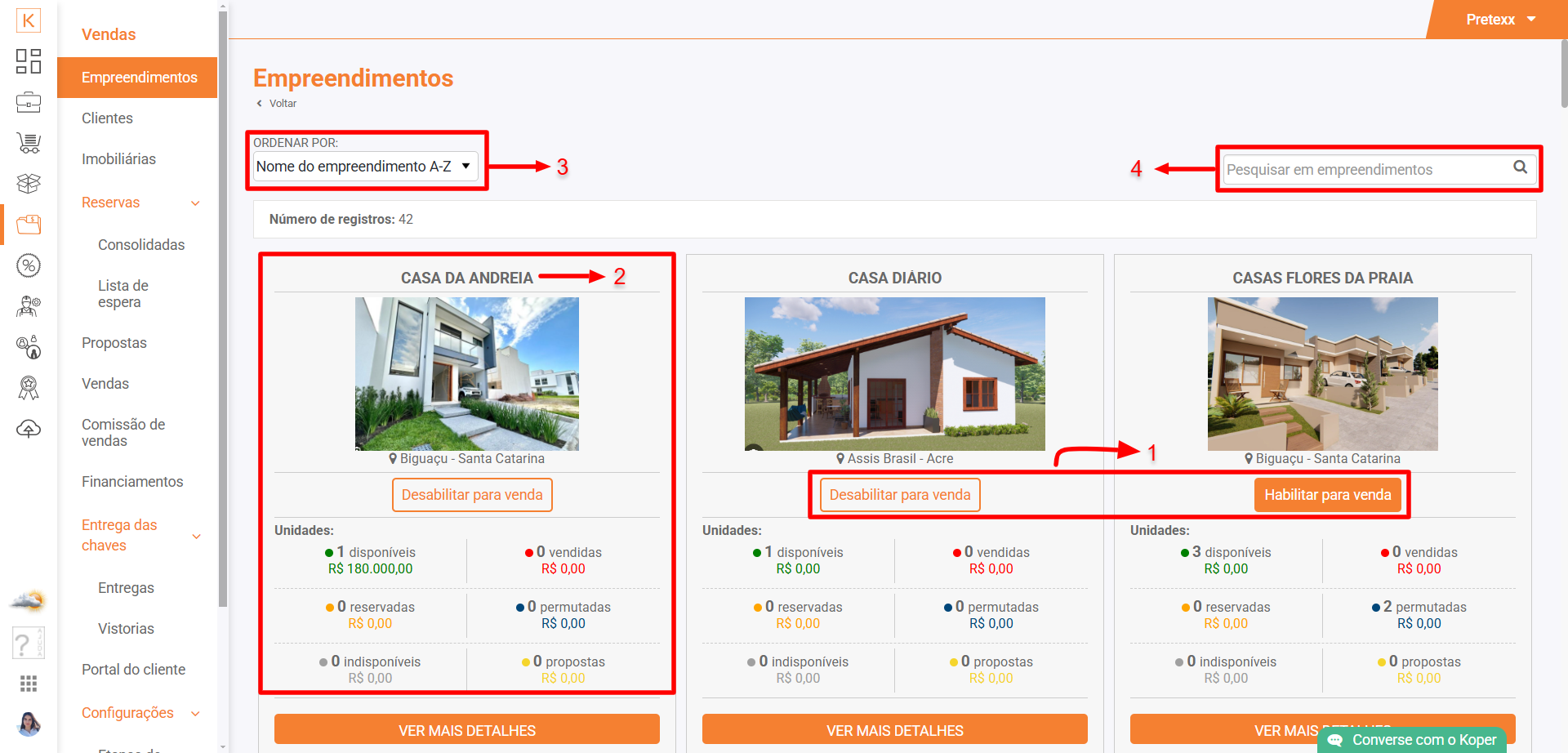 Acesse seus empreendimentos, habilite ou desabilite para venda e muito mais