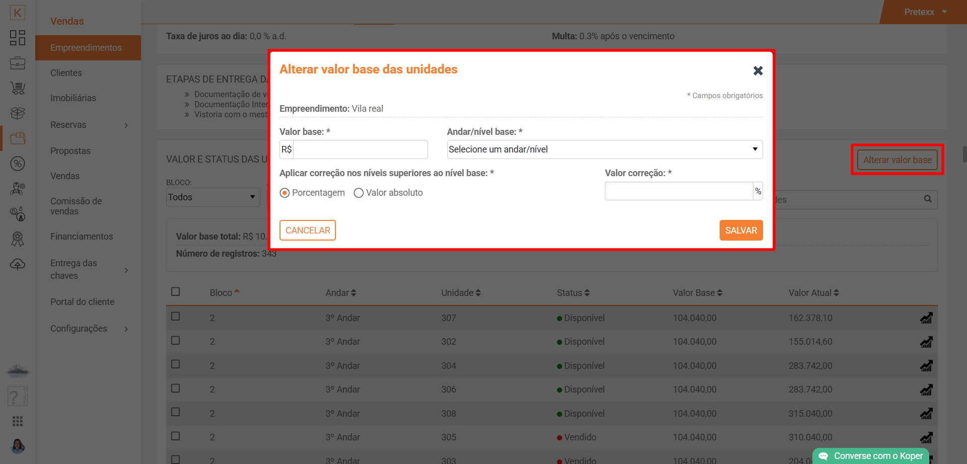 - Encontre o empreendimento que deseja alterar valor base das unidades;