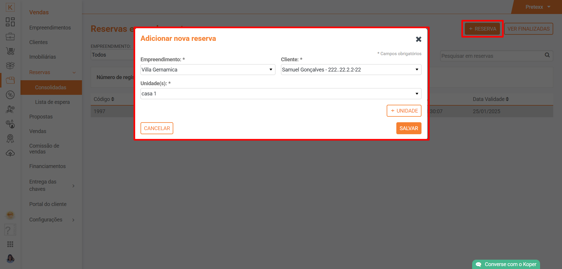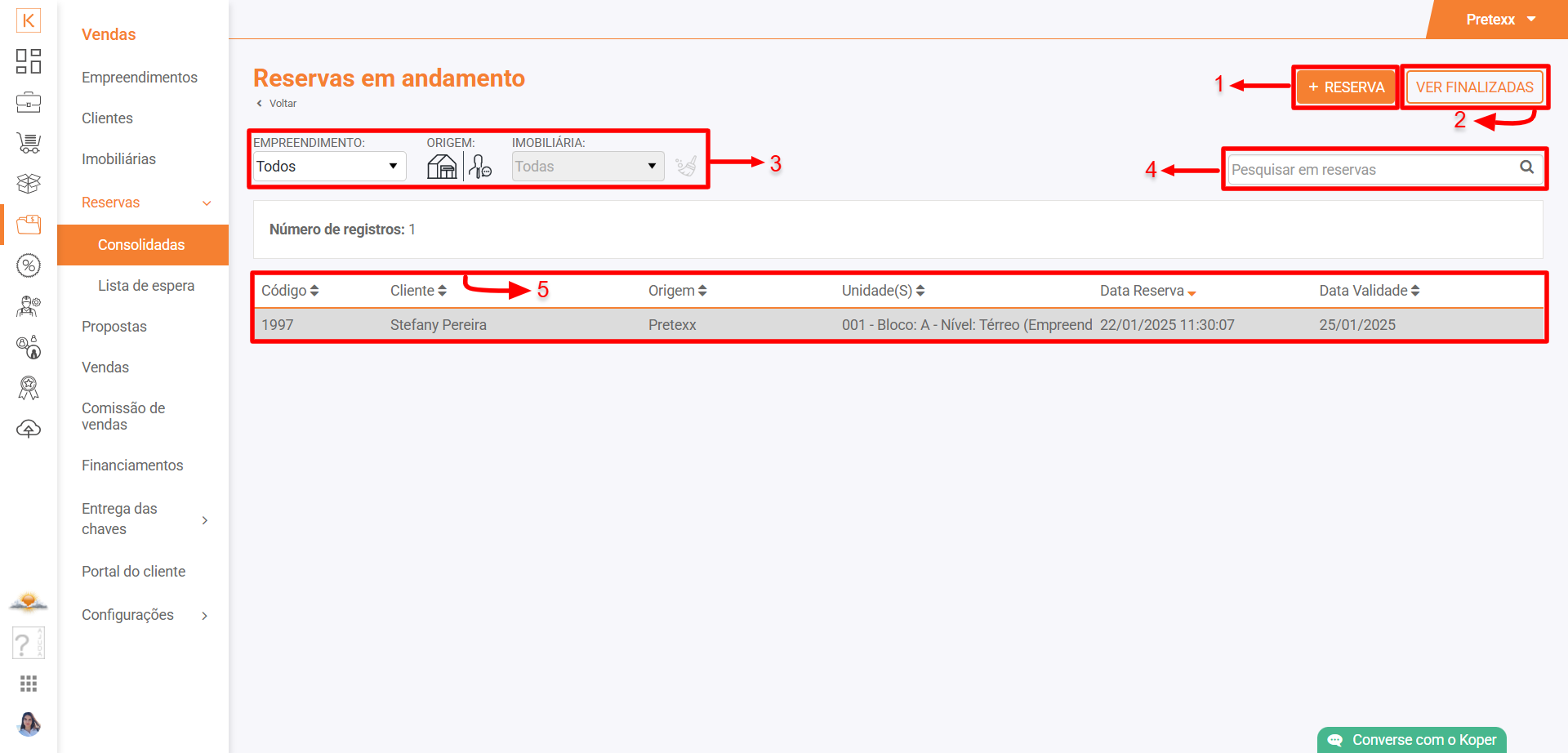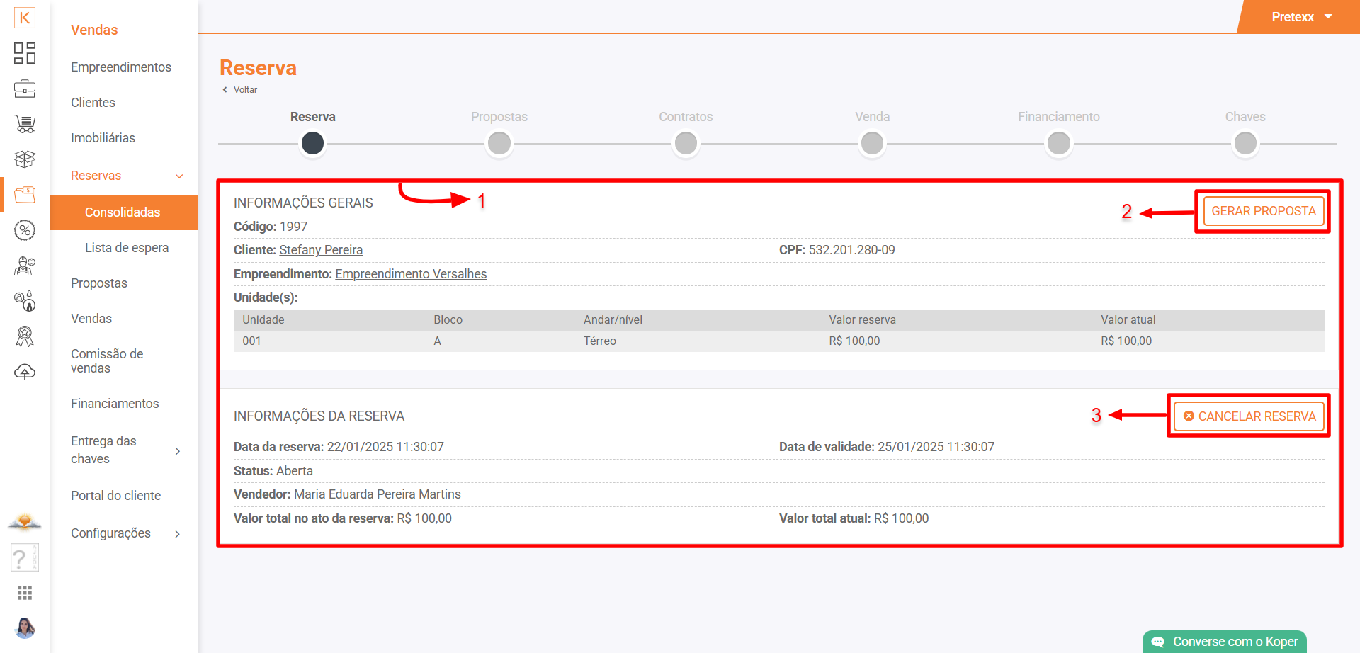Acesse Koper > Vendas > Reservas > Consolidadas