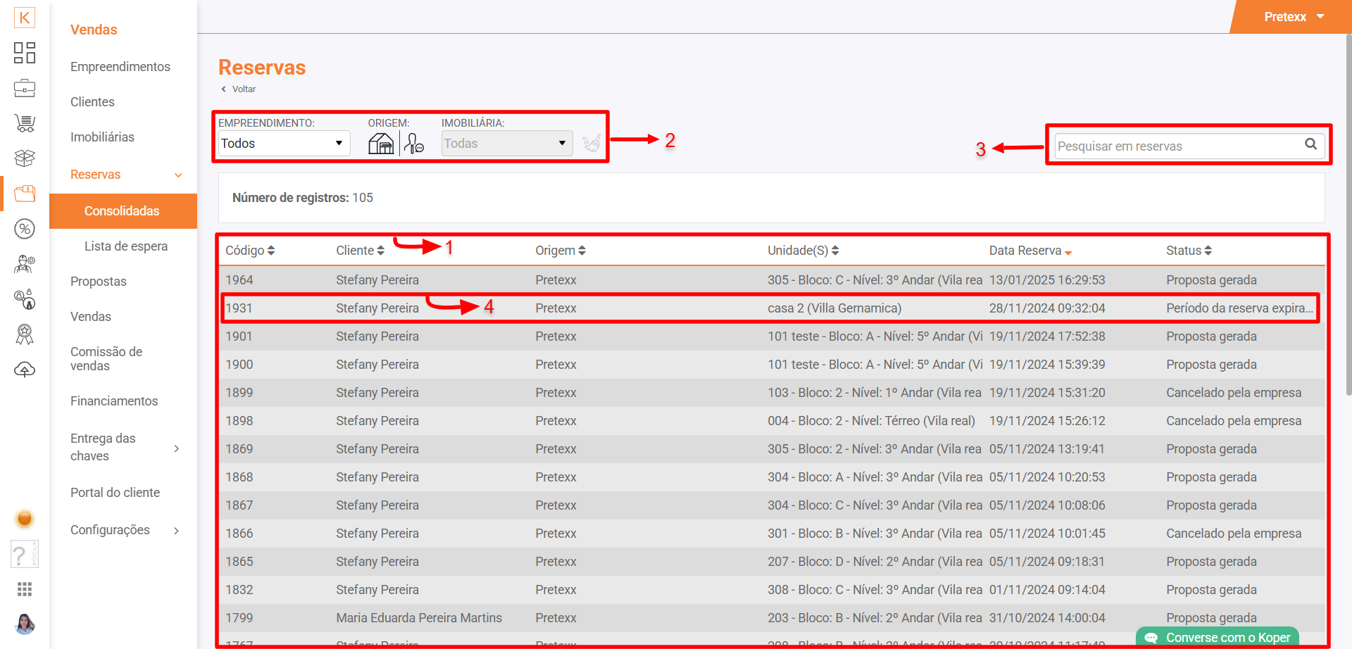 - 3. Utilizar filtros: Empreendimento, origem (empresa/imobiliária) e no caso de ser uma reserva feita por imobiliária, pesquisar entre as imobiliárias cadastradas, e/ou limpar os filtros;