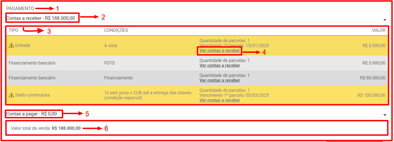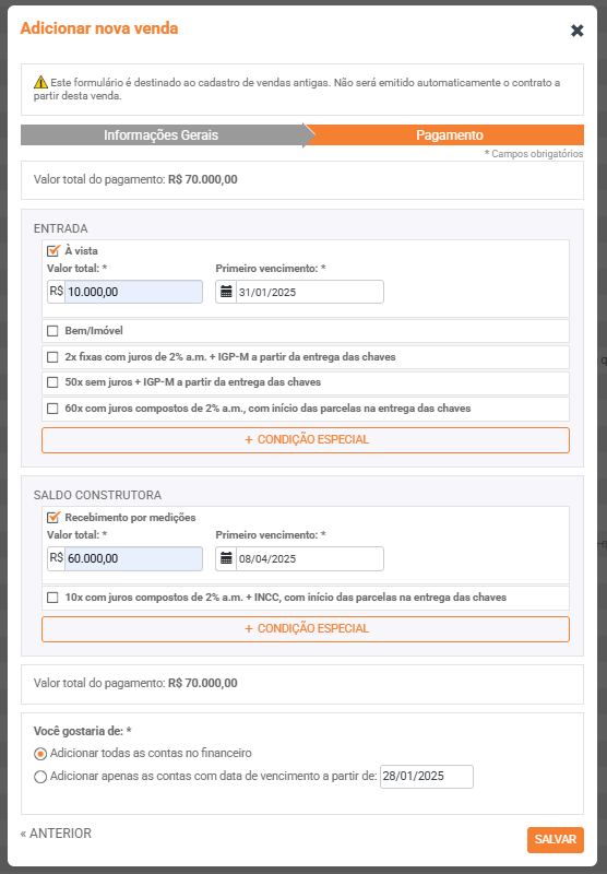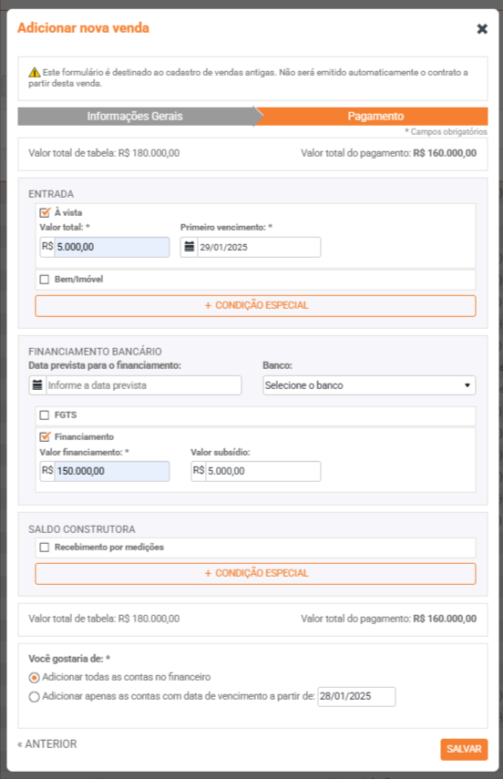 - Vale lembrar que em obras para clientes, em Pagamento só é apresentado o painel ENTRADA e SALDO CONSTRUTORA, não deixando a opção de financiamento com o banco liberada;