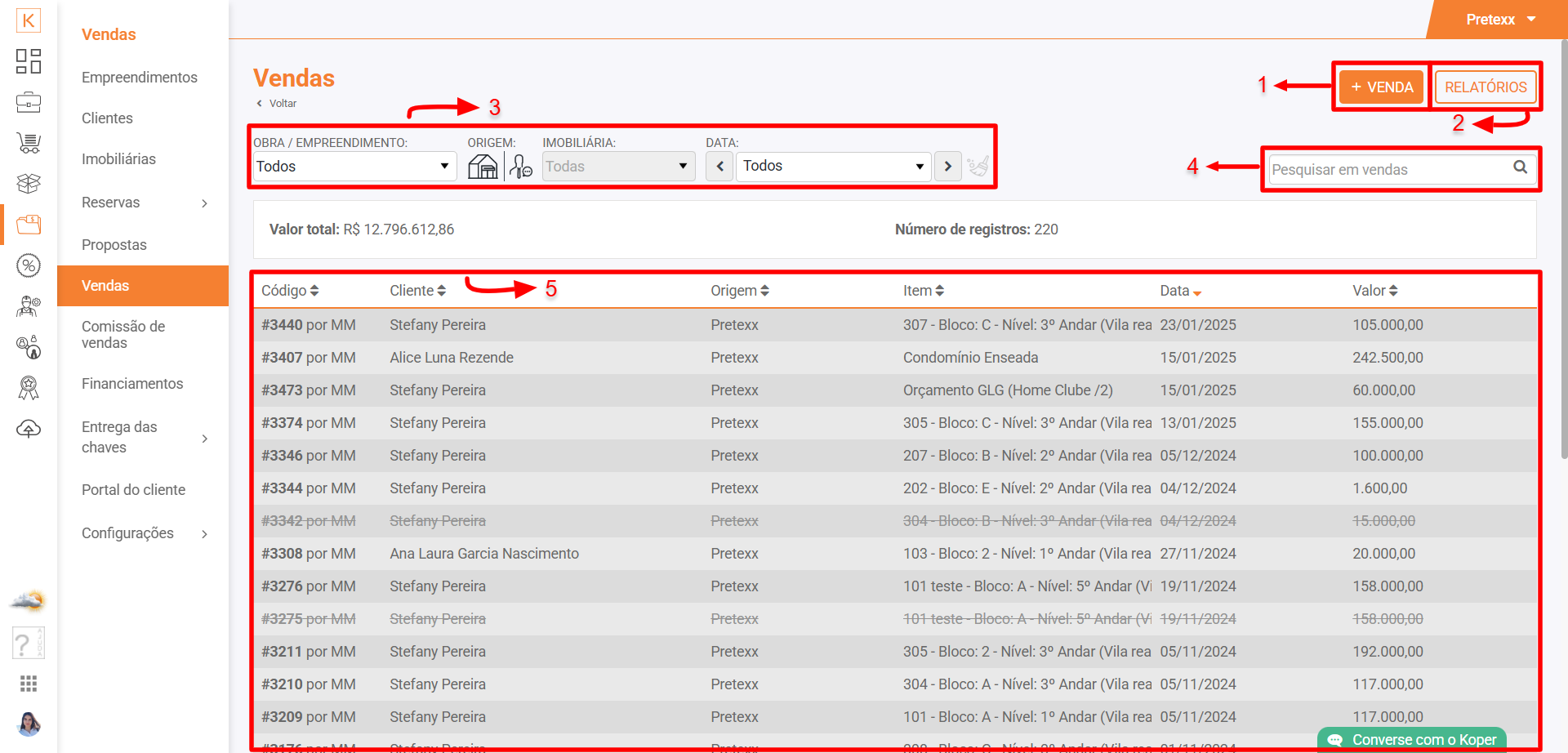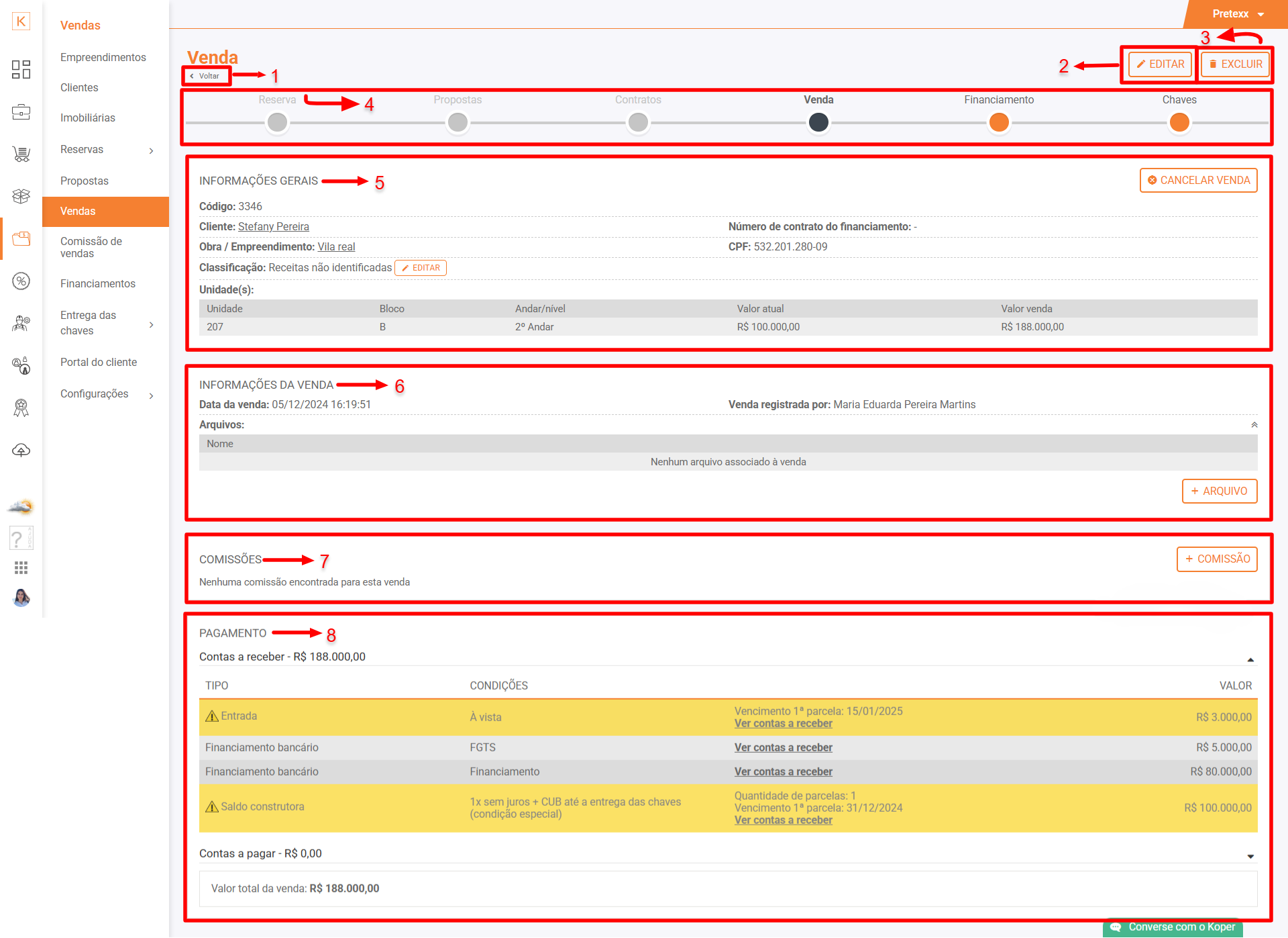 - venda do empreendimento ela possuirá 4 etapas no fluxo de venda - orçamento, proposta, contrato, venda